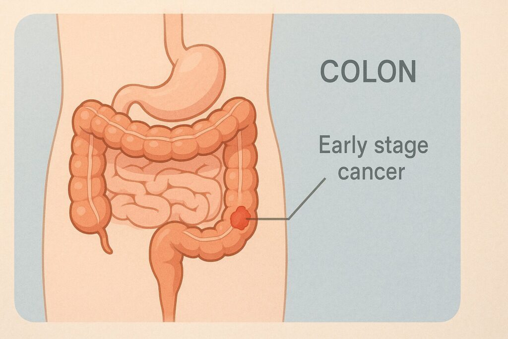 ステージ1は、癌が大腸の壁の浅い部分にとどまり、まだ リンパ節転移(N0) や 遠隔転移(M0) が認められない段階です。このため治療の負担が比較的軽く済む傾向があり、予後も良好とされています。