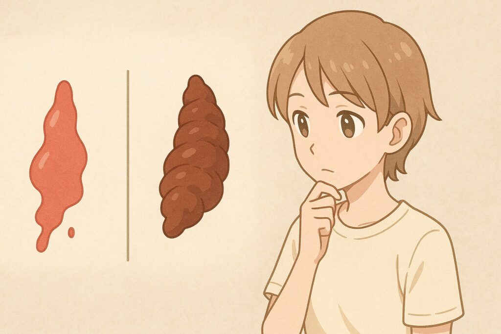 | 直腸・肛門付近 | ほぼ酸化しない状態で出血 | 鮮血便(ティッシュに付着する血など) |
