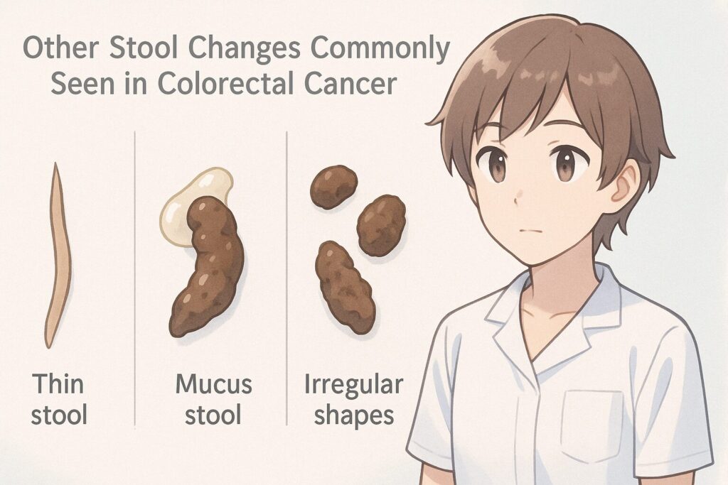 🔵大腸癌では、便が細い・粘液が出る・悪臭が強いなど、色以外の変化も重要な手がかりになる。