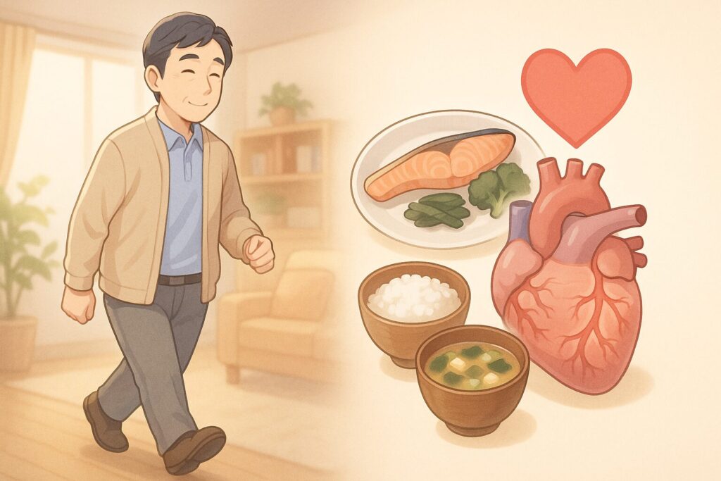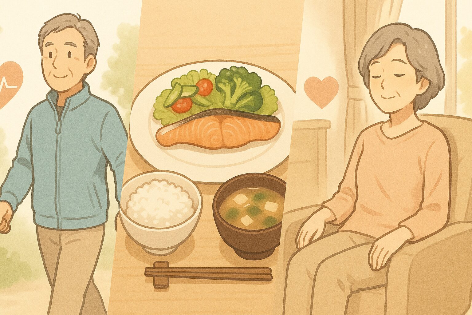 塩分や脂質を控えめにしつつ、野菜や魚を意識することが基本です。完璧を目指すより、「外食の頻度を減らす」「味付けを少し薄くする」など小さな調整が現実的です。