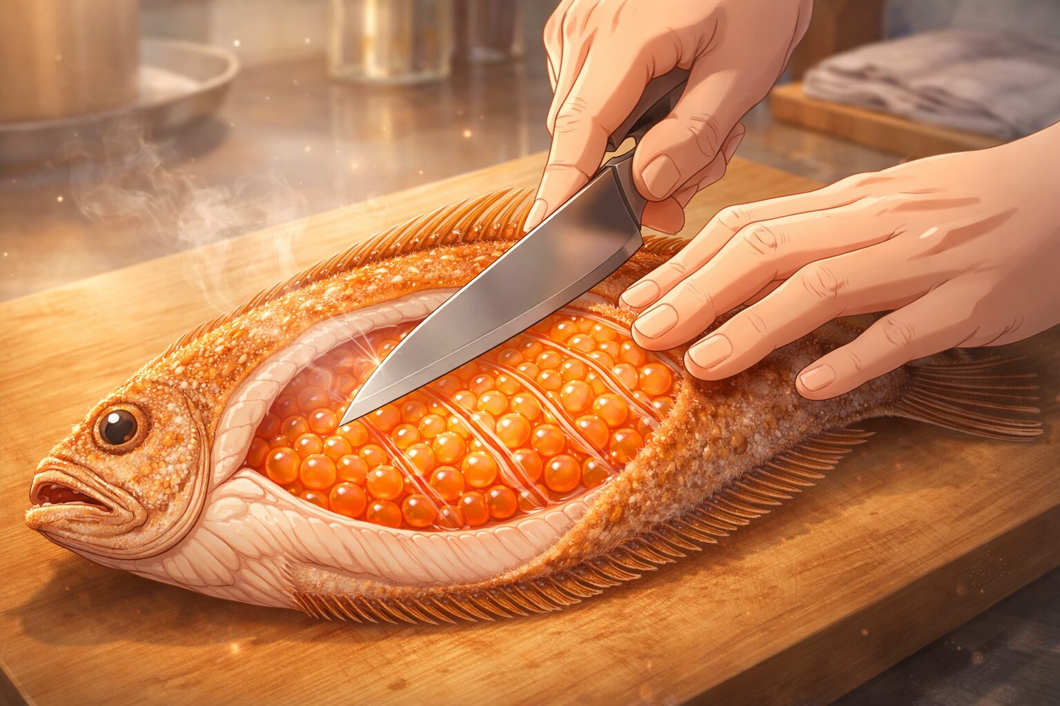 子持ちカレイの特徴でもある“”。この部分こそが、爆発の主な要因になりやすいポイントです。