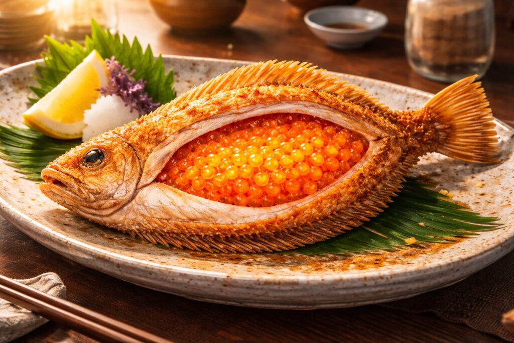 子持ちカレイの卵は、火を通すことでホクホクとした食感になり、唐揚げとの相性もとても良くなります。